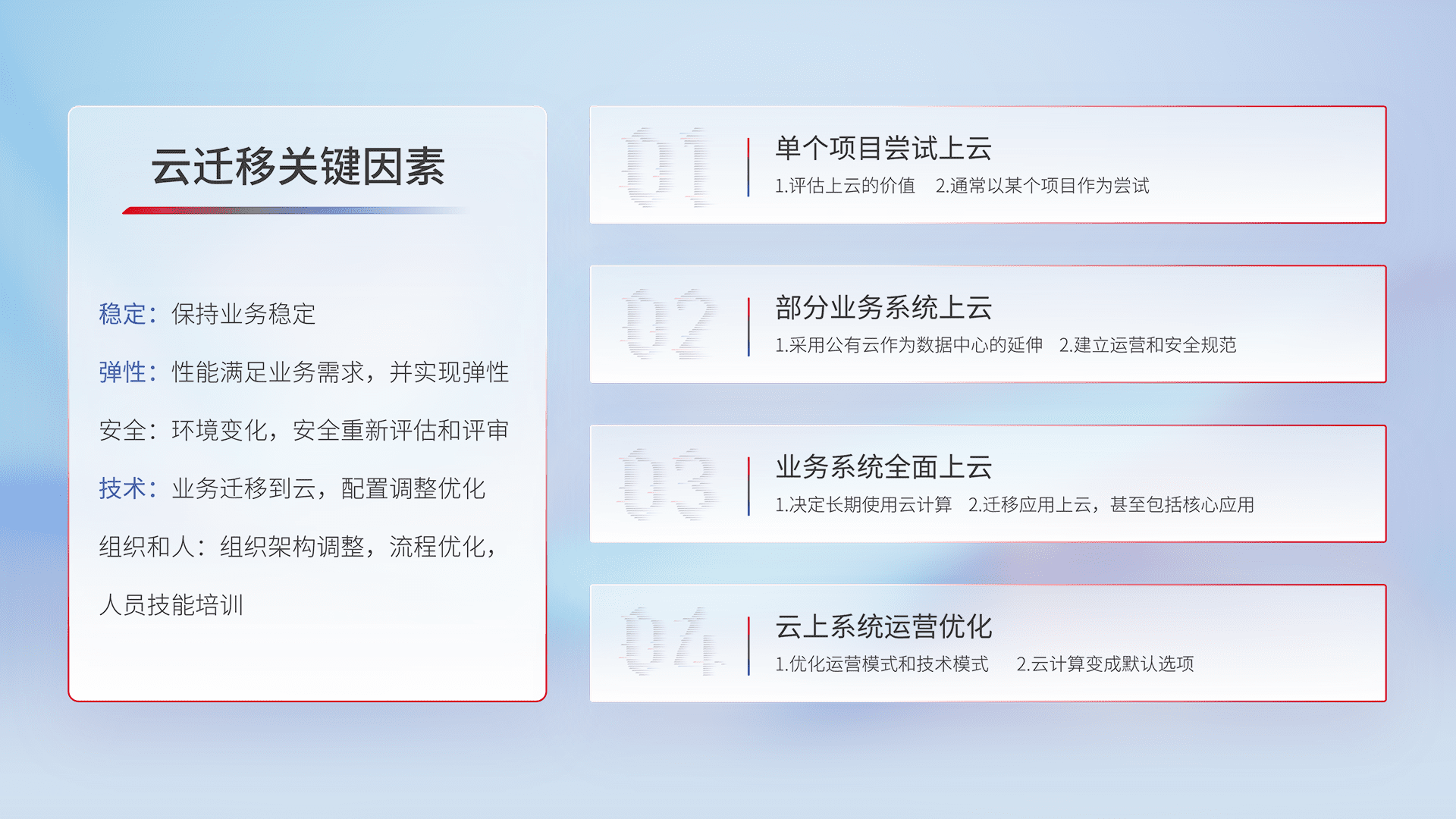 结合实际业务,,,,从规划设计、、、云平台选型、、、云原生改造、、、数据迁移、、集成交付,,,迁移全过程为客户识别最佳上云路径,,做好风险识别管理,,设计网络架构、、身份权限、、、、安全审计合规、、操作审计、、、、日志审计、、、、监控告警策略、、、、多站点容灾设计等,,对云上基础设施进行整体规划,,,提升IT治理水平,,,,以满足弹性、、高可用、、高性能的需求。。。