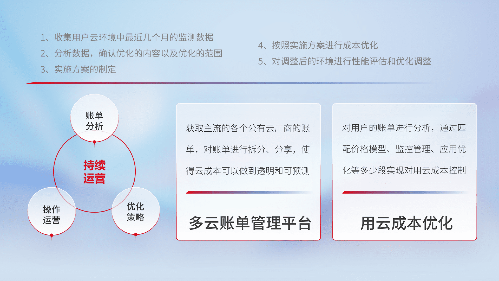 通过多云纳管,,,,以统一的资源数据模型把客户的云资源进行抽象和封装,,,进而实现对多云资源的统一操作,,保障云资源管理的可靠性、、、、稳定性与可用性。。量身定制化运维内容,,,配置、、、开发运维、、、补丁管理、、备份、、监控、、认证和访问管理、、审计和日常巡检等,,保障在用云过程中的可靠度,,,,稳定度以及高可用率。。。。